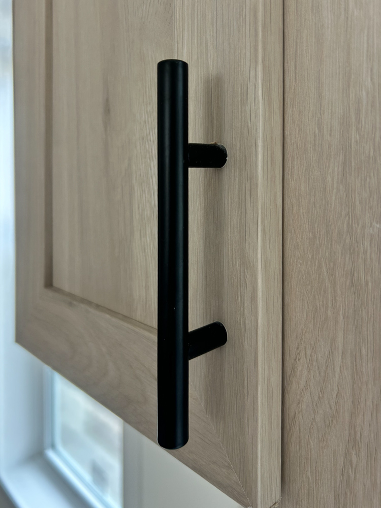 - MDF Shaker Cab Doors with Black Hardware and Hidden Hinges